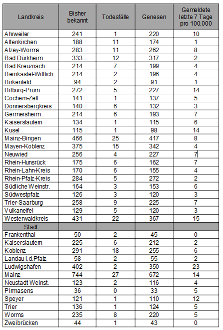 Die oben genannten Zahlen entsprechen den in der Meldesoftware des Robert Koch-Instituts übermittelten laborbestätigten Fällen einer COVID-19 Erkrankung mit Meldeadresse in Rheinland-Pfalz. Diese werden von den Gesundheitsämtern über die Landesmeldestelle beim Landesuntersuchungsamt an das Robert Koch-Institut übermittelt. Diese Zahlen können vereinzelt von den durch die Kreisverwaltungen kommunizierten Zahlen abweichen.