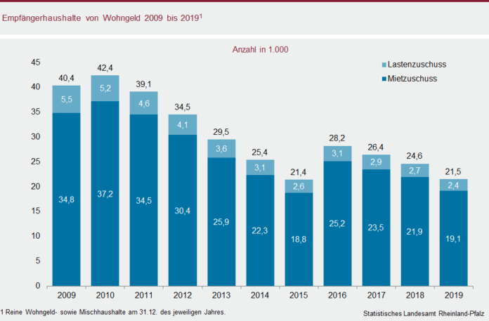 Zum Jahresende 2019 bezogen in Rheinland-Pfalz 21.500 Haushalte Wohngeld. Nach Angaben des Statistischen Landesamt waren dies knapp 3.100 bzw. 13 Prozent weniger Fälle als im Vorjahr. Die Anzahl der Empfängerhaushalte ist – nach Inkrafttreten der Anpassung von Miethöhen und Einkommensgrenzen 2016 – das dritte Jahr in Folge gesunken.