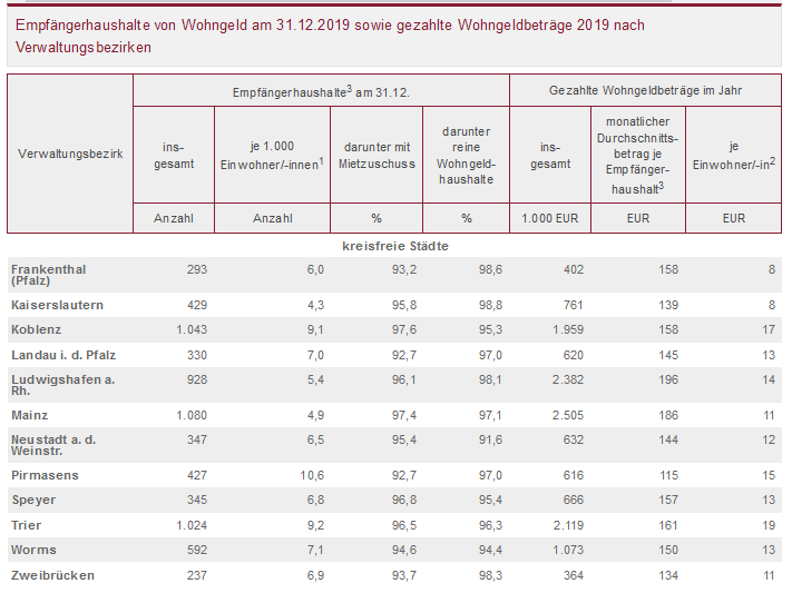 Die Stadt Pirmasens wies bezogen auf die Bevölkerung die relativ höchste Zahl an Empfängerhaushalten auf. Auf 1.000 Einwohnerinnen und Einwohner kamen dort knapp elf Haushalte mit Wohngeldbezug; dahinter folgten Trier und Koblenz, die mit 9,2 bzw. 9,1 wohngeldbeziehenden Haushalten jeweils deutlich oberhalb des Landesschnitts von 5,3 Wohngeldhaushalten lagen. Mit einem Wert von 2,6 wurde im Landkreis Trier-Saarburg die niedrigste Quote ermittelt.