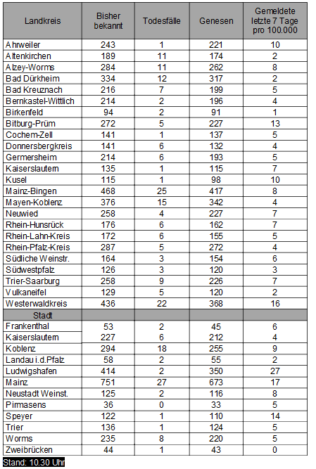 Die oben genannten Zahlen entsprechen den in der Meldesoftware des Robert Koch-Instituts übermittelten laborbestätigten Fällen einer COVID-19 Erkrankung mit Meldeadresse in Rheinland-Pfalz. Diese werden von den Gesundheitsämtern über die Landesmeldestelle beim Landesuntersuchungsamt an das Robert Koch-Institut übermittelt. Diese Zahlen können vereinzelt von den durch die Kreisverwaltungen kommunizierten Zahlen abweichen.