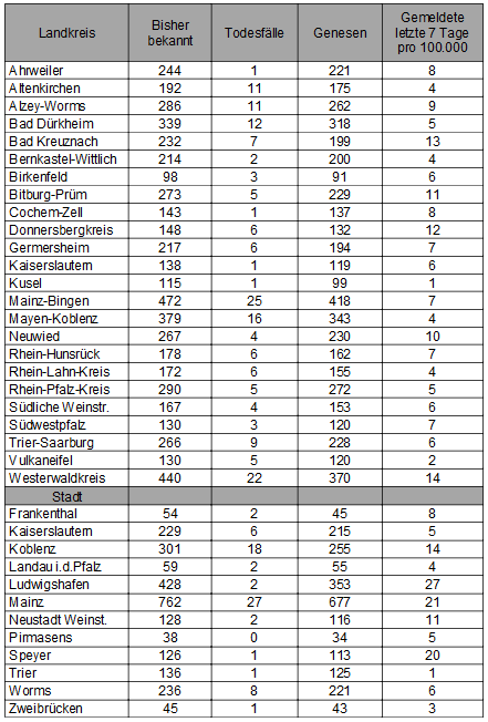 Die oben genannten Zahlen entsprechen den in der Meldesoftware des Robert Koch-Instituts übermittelten laborbestätigten Fällen einer COVID-19 Erkrankung mit Meldeadresse in Rheinland-Pfalz. Diese werden von den Gesundheitsämtern über die Landesmeldestelle beim Landesuntersuchungsamt an das Robert Koch-Institut übermittelt. Diese Zahlen können vereinzelt von den durch die Kreisverwaltungen kommunizierten Zahlen abweichen.