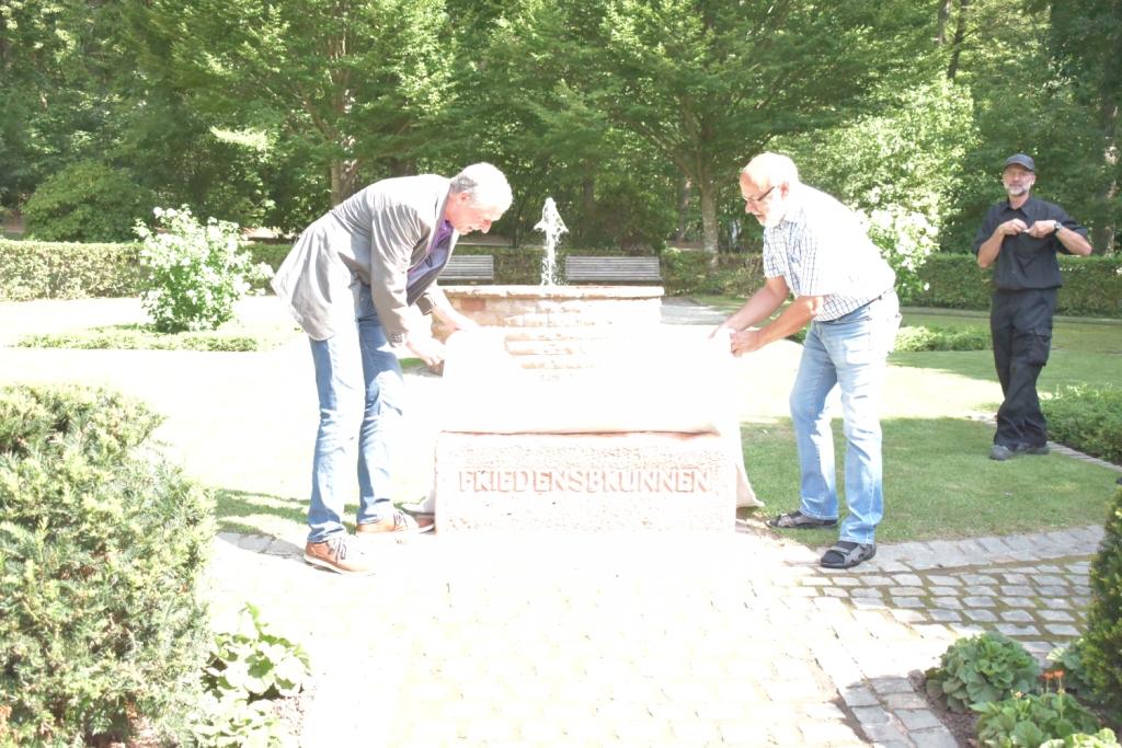 Bild v.l.: Beigeordneter Peter Kiefer und Wettbewerbsteilnehmer Bernhard Opp bei der „Taufe“ des Friedensbrunnens. Rechts im Hintergrund: Steinmetz Harald Deege