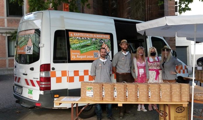 BU: Mitarbeiterinnen und Mitarbeiter der ZAK haben, wie hier auf dem Wochenmarkt in Kaiserslautern, in den letzten zwei Wochen die Almabtrieb-Pakete in der Stadt und im Landkreis verteilt.