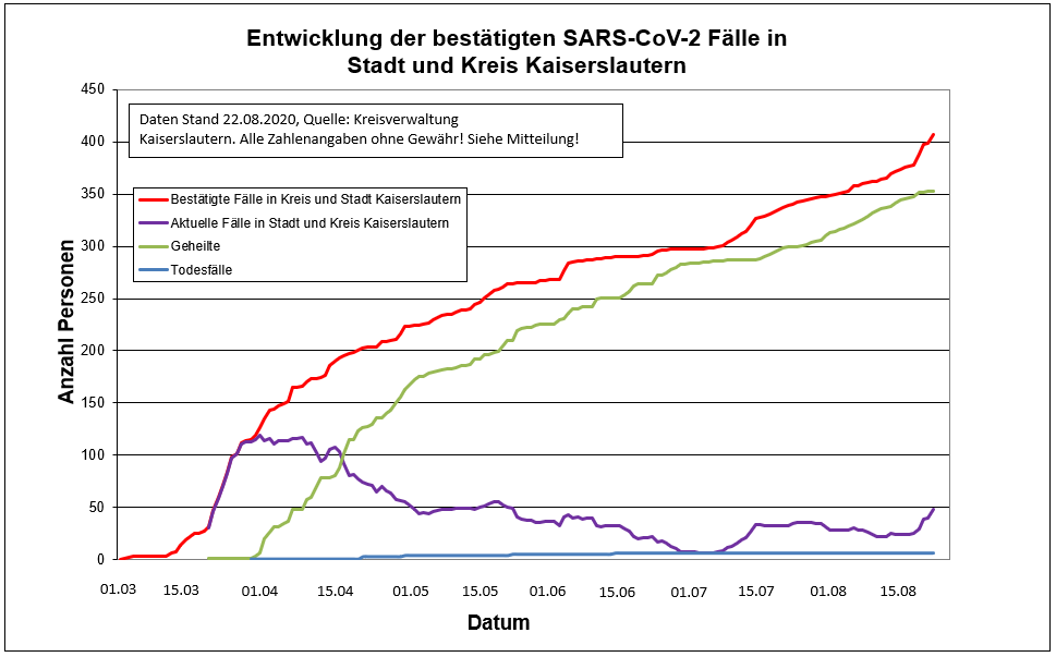 Zurzeit gibt es 407 Indexfälle in Stadt und Landkreis Kaiserslautern. Aufgrund landeseinheitlicher RKI-Vorgaben werden die 353 genesenen Personen und die mittlerweile 6 Todesfälle jedoch weiter in der Gesamtstatistik der positiven Fälle weiter mitgeführt.