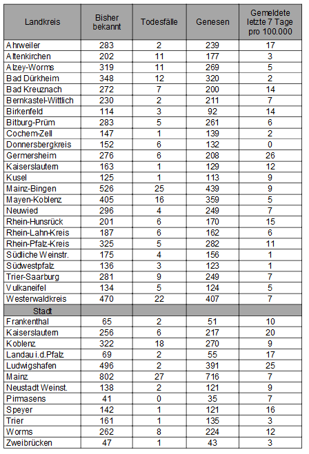 Die oben genannten Zahlen entsprechen den in der Meldesoftware des Robert Koch-Instituts übermittelten laborbestätigten Fällen einer COVID-19 Erkrankung mit Meldeadresse in Rheinland-Pfalz. Diese werden von den Gesundheitsämtern über die Landesmeldestelle beim Landesuntersuchungsamt an das Robert Koch-Institut übermittelt. Diese Zahlen können vereinzelt von den durch die Kreisverwaltungen kommunizierten Zahlen abweichen.