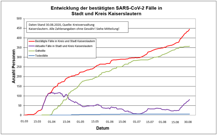 Am 30.08. wurden 7 Personen aus dem Landkreis positiv getestet , 1 Person aus der Stadt KL konnte aus der Quarantäne entlassen werden. Aktuell sind im Zuständigkeitsbereich des Gesundheitsamtes 82 Personen positiv auf das Coronavirus getestet.
