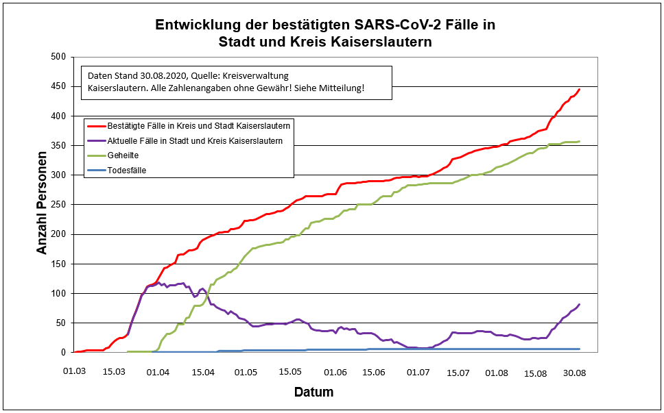 Zurzeit gibt es 445 Indexfälle in Stadt und Landkreis Kaiserslautern. Aufgrund landeseinheitlicher RKI-Vorgaben werden die 357 genesenen Personen und die mittlerweile 6 Todesfälle jedoch weiter in der Gesamtstatistik der positiven Fälle weiter mitgeführt.
