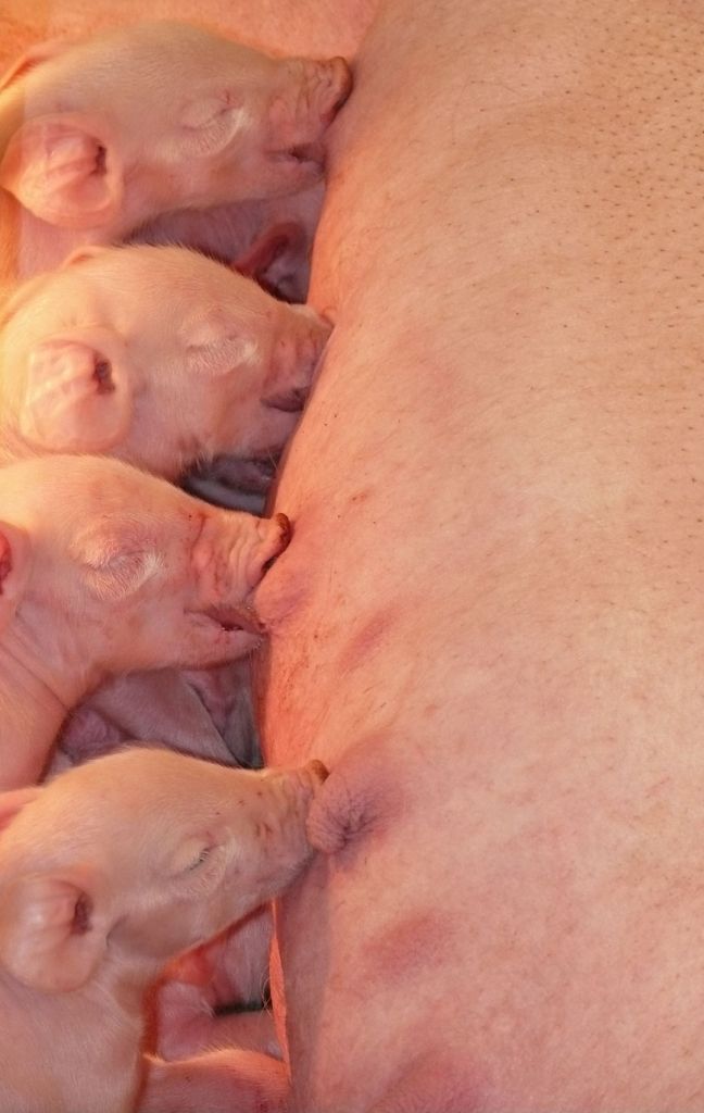Viele Mäulchen wollen ran: Mutterschwein beim Säugen ihrer Ferkel
