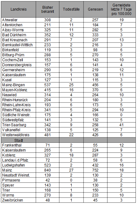 Die oben genannten Zahlen entsprechen den in der Meldesoftware des Robert Koch-Instituts übermittelten laborbestätigten Fällen einer COVID-19 Erkrankung mit Meldeadresse in Rheinland-Pfalz. Diese werden von den Gesundheitsämtern über die Landesmeldestelle beim Landesuntersuchungsamt an das Robert Koch-Institut übermittelt. Diese Zahlen können vereinzelt von den durch die Kreisverwaltungen kommunizierten Zahlen abweichen.