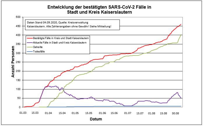 Zurzeit gibt es 460 Indexfälle in Stadt und Landkreis Kaiserslautern. Aufgrund landeseinheitlicher RKI-Vorgaben werden die 403 genesenen Personen und die mittlerweile 6 Todesfälle jedoch weiter in der Gesamtstatistik der positiven Fälle weiter mitgeführt.