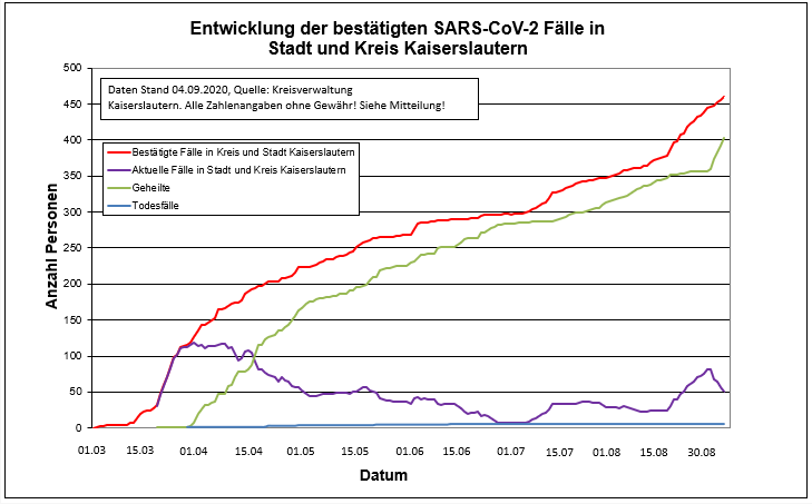 Am 04.09. gab es 5 positive Testergebnisse (2x Stadt Kaiserslautern, 3 x LK KL). 11 Personen (2x Stadt, 9x Kreis) konnten aus der Quarantäne entlassen werden. Aktuell sind 51 Personen mit Corona infiziert.