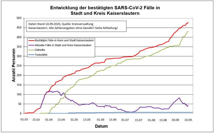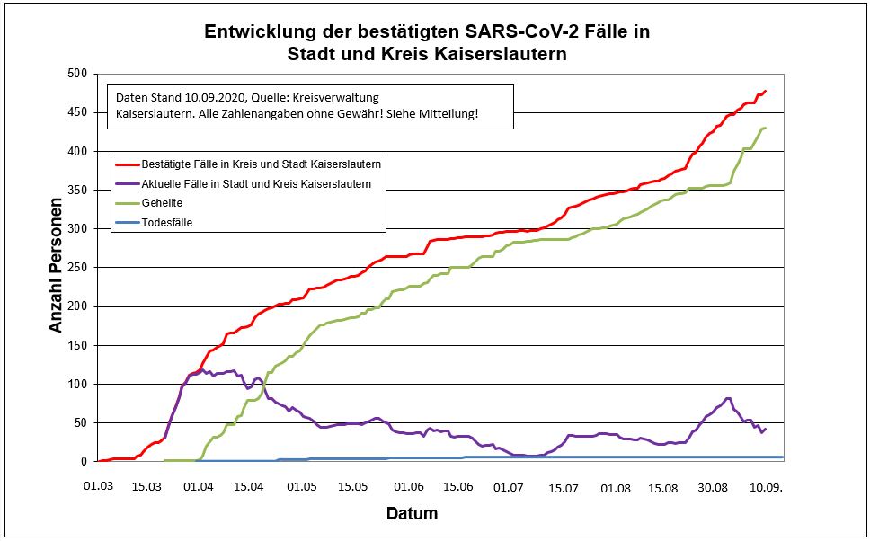 Zurzeit gibt es 478 Indexfälle in Stadt und Landkreis Kaiserslautern. Aufgrund landeseinheitlicher RKI-Vorgaben werden die 430 genesenen Personen und die mittlerweile 6 Todesfälle jedoch weiter in der Gesamtstatistik der positiven Fälle weiter mitgeführt.