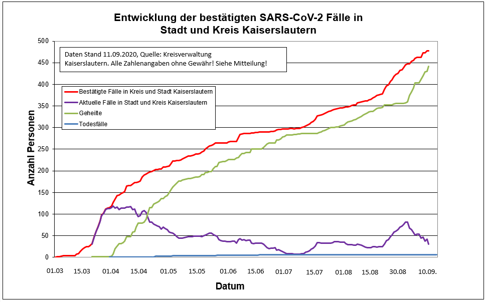 Am 11.09. gab es keine neuen Indexfälle. Aber 12 Personen (2x Stadt und 10x Landkreis) konnten aus der Quarantäne entlassen werden. Aktuell sind damit noch 30 Personen an Corona erkrankt. Zurzeit gibt es 478 Indexfälle in Stadt und Landkreis Kaiserslautern. Aufgrund landeseinheitlicher RKI-Vorgaben werden die 442 genesenen Personen und die mittlerweile 6 Todesfälle jedoch weiter in der Gesamtstatistik der positiven Fälle weiter mitgeführt.