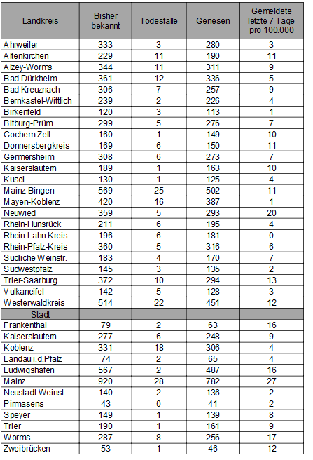 Die oben genannten Zahlen entsprechen den in der Meldesoftware des Robert Koch-Instituts übermittelten laborbestätigten Fällen einer COVID-19 Erkrankung mit Meldeadresse in Rheinland-Pfalz. Diese werden von den Gesundheitsämtern über die Landesmeldestelle beim Landesuntersuchungsamt an das Robert Koch-Institut übermittelt. Diese Zahlen können vereinzelt von den durch die Kreisverwaltungen kommunizierten Zahlen abweichen.
