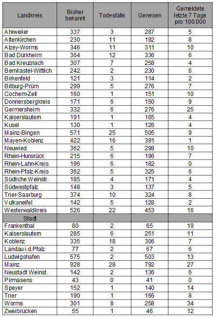 Die oben genannten Zahlen entsprechen den in der Meldesoftware des Robert Koch-Instituts übermittelten laborbestätigten Fällen einer COVID-19 Erkrankung mit Meldeadresse in Rheinland-Pfalz. Diese werden von den Gesundheitsämtern über die Landesmeldestelle beim Landesuntersuchungsamt an das Robert Koch-Institut übermittelt. Diese Zahlen können vereinzelt von den durch die Kreisverwaltungen kommunizierten Zahlen abweichen.