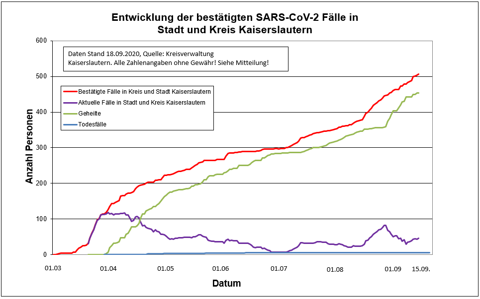 Zurzeit gibt es 507 Indexfälle in Stadt und Landkreis Kaiserslautern. Aufgrund landeseinheitlicher RKI-Vorgaben werden die 454 genesenen Personen und die mittlerweile 6 Todesfälle jedoch weiter in der Gesamtstatistik der positiven Fälle weiter mitgeführt.