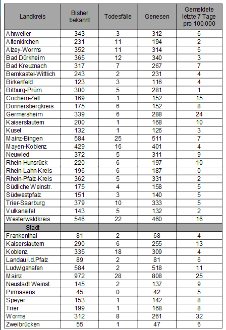 Die oben genannten Zahlen entsprechen den in der Meldesoftware des Robert Koch-Instituts übermittelten laborbestätigten Fällen einer COVID-19 Erkrankung mit Meldeadresse in Rheinland-Pfalz. Diese werden von den Gesundheitsämtern über die Landesmeldestelle beim Landesuntersuchungsamt an das Robert Koch-Institut übermittelt. Diese Zahlen können vereinzelt von den durch die Kreisverwaltungen kommunizierten Zahlen abweichen.
