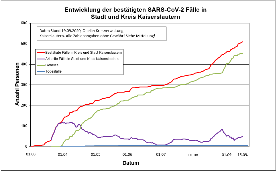 Aktuell sind 49 Personen an Corona erkrankt. Zurzeit gibt es 509 Indexfälle in Stadt und Landkreis Kaiserslautern. Aufgrund landeseinheitlicher RKI-Vorgaben werden die 454 genesenen Personen und die mittlerweile 6 Todesfälle jedoch weiter in der Gesamtstatistik der positiven Fälle weiter mitgeführt.