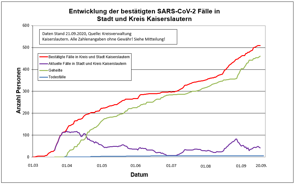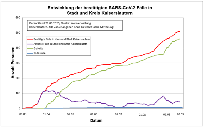 Zurzeit gibt es 509 Indexfälle in Stadt und Landkreis Kaiserslautern. Aufgrund landeseinheitlicher RKI-Vorgaben werden die 461 genesenen Personen und die mittlerweile 6 Todesfälle jedoch weiter in der Gesamtstatistik der positiven Fälle weiter mitgeführt.