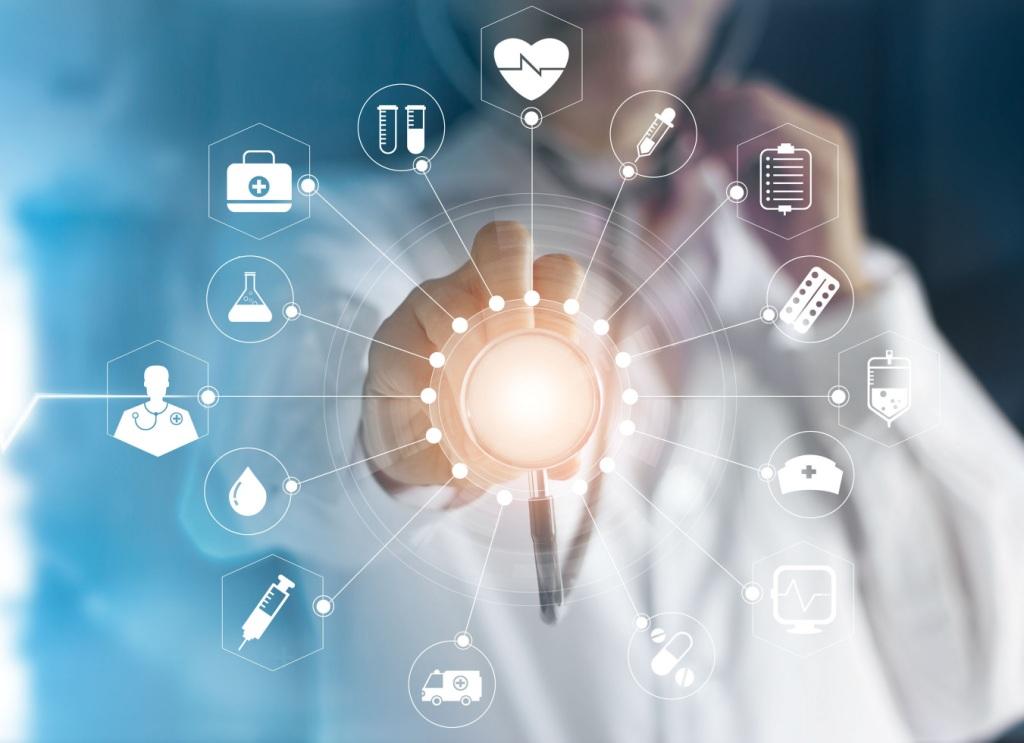 Bu: Mediziner und Stethoskop in Hand, die die Verbindung zwischen dem medizinischen Netz und dem modernen virtuellen Bildschirm, dem Konzept des medizinischen Netzwerks