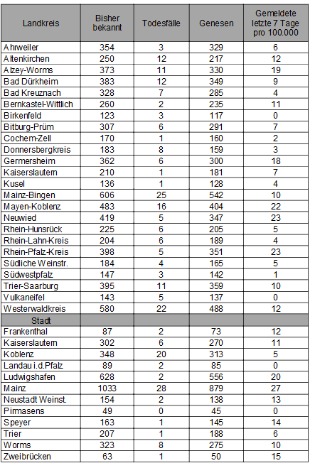 Die oben genannten Zahlen entsprechen den in der Meldesoftware des Robert Koch-Instituts übermittelten laborbestätigten Fällen einer COVID-19 Erkrankung mit Meldeadresse in Rheinland-Pfalz. Diese werden von den Gesundheitsämtern über die Landesmeldestelle beim Landesuntersuchungsamt an das Robert Koch-Institut übermittelt. Diese Zahlen können vereinzelt von den durch die Kreisverwaltungen kommunizierten Zahlen abweichen.