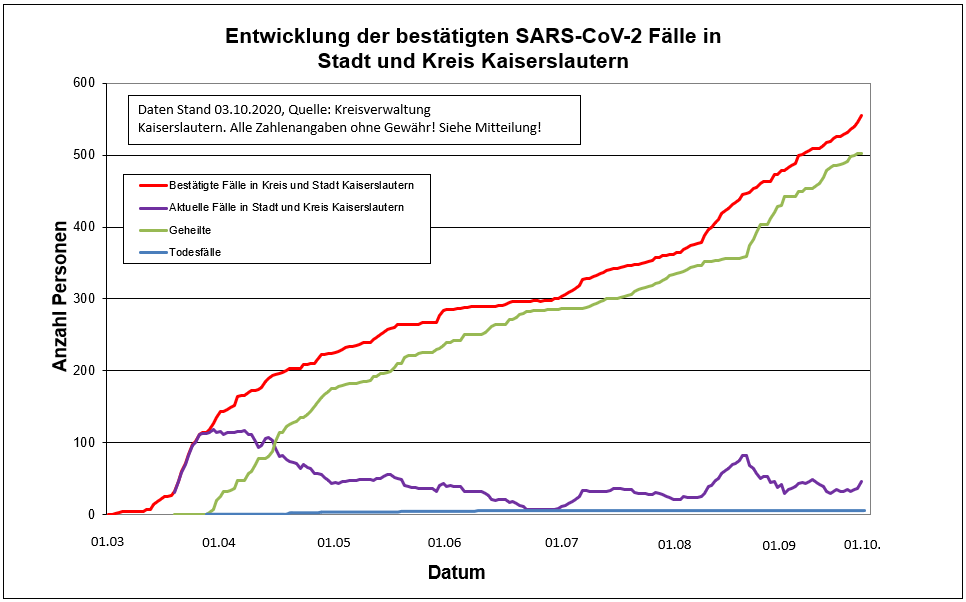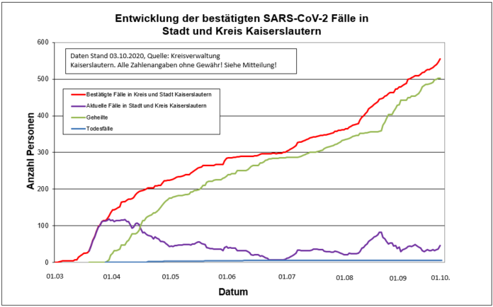 Zurzeit gibt es 555 Indexfälle in Stadt und Landkreis Kaiserslautern. Aufgrund landeseinheitlicher RKI-Vorgaben werden die 502 genesenen Personen und die mittlerweile 6 Todesfälle jedoch weiter in der Gesamtstatistik der positiven Fälle weiter mitgeführt.