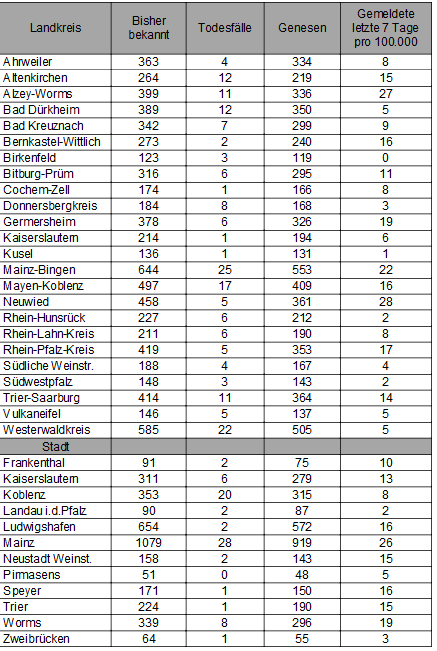 Die oben genannten Zahlen entsprechen den in der Meldesoftware des Robert Koch-Instituts übermittelten laborbestätigten Fällen einer COVID-19 Erkrankung mit Meldeadresse in Rheinland-Pfalz. Diese werden von den Gesundheitsämtern über die Landesmeldestelle beim Landesuntersuchungsamt an das Robert Koch-Institut übermittelt. Diese Zahlen können vereinzelt von den durch die Kreisverwaltungen kommunizierten Zahlen abweichen.