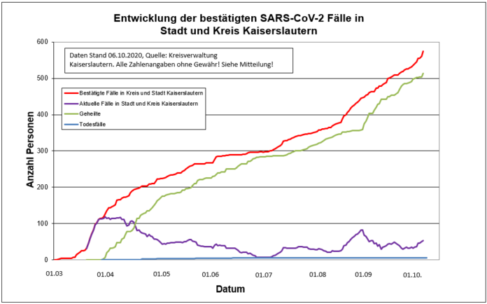 Am 06.10. wurden 14 neue Indexfälle (11 x Landkreis Kaiserslautern, 3 x Stadt Kaiserslautern) gemeldet. 11 Personen (6 x Stadt 5 x Landkreis) konnten aus der Quarantäne entlassen werden. Aktuell sind 54 Personen mit Corona-Infektionen registriert.