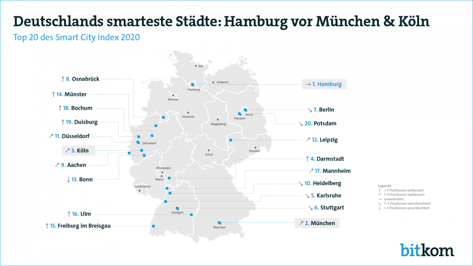 Deutschlands smarteste Städte: Hamburg verteidigt den Titel, München und Köln holen auf