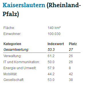 Mit Platz 27 in der Gesamtwertung erreicht Kaiserslautern den vordersten Rang in Rheinland-Pfalz. Einzelbewertung Kaiserslautern