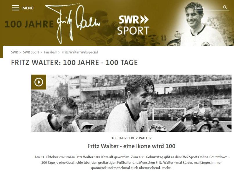 Auf swr.de/sport ist seit Juli der Countdown „Fritz Walter: 100 Jahre – 100 Tage“ abrufbar. In Videos, Audios, Fotos und kurzen Texte gibt es hier täglich, 100 Tage lang, eine neue spannende Geschichte mit und über den gebürtigen Kaiserslauterer Fritz Walter.