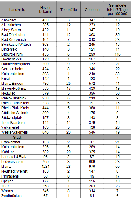 Die oben genannten Zahlen entsprechen den in der Meldesoftware des Robert Koch-Instituts übermittelten laborbestätigten Fällen einer COVID-19 Erkrankung mit Meldeadresse in Rheinland-Pfalz. Diese werden von den Gesundheitsämtern über die Landesmeldestelle beim Landesuntersuchungsamt an das Robert Koch-Institut übermittelt. Diese Zahlen können vereinzelt von den durch die Kreisverwaltungen kommunizierten Zahlen abweichen.