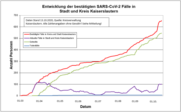 Insgesamt wurden bislang 653 Indexfälle in Stadt und Landkreis Kaiserslautern registriert. Aufgrund landeseinheitlicher RKI-Vorgaben werden die 545 genesenen Personen und die mittlerweile 6 Todesfälle jedoch weiter in der Gesamtstatistik der positiven Fälle weiter mitgeführt.