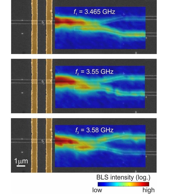 Abb. 2: Die Hauptfunktionalität des nanoskopischen Richtkopplers besteht darin, dass er eine Spinwelle in Abhängigkeit von ihrer Frequenz, ihrer Intensität oder vom angelegten Magnetfeld in verschiedene Ausgänge leiten kann.