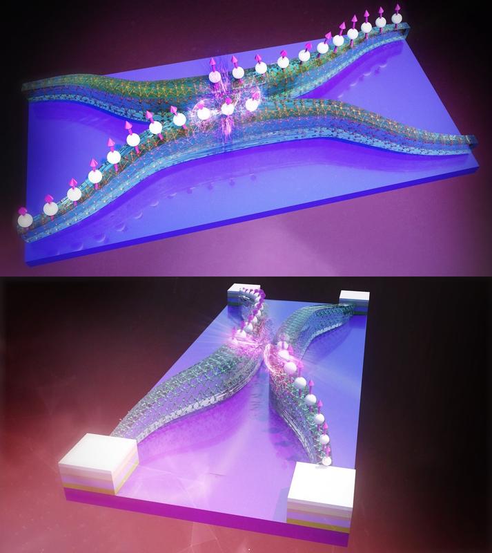 Bu: Abb. 1: Der Richtkoppler ist mit sichtbaren Atomstruktur dargestellt. Die Spinwelle springt von einer Nanodraht-Leitung zu einer anderen Nanodraht-Leitung – dort, wo sich die Leitungen einander nähern.