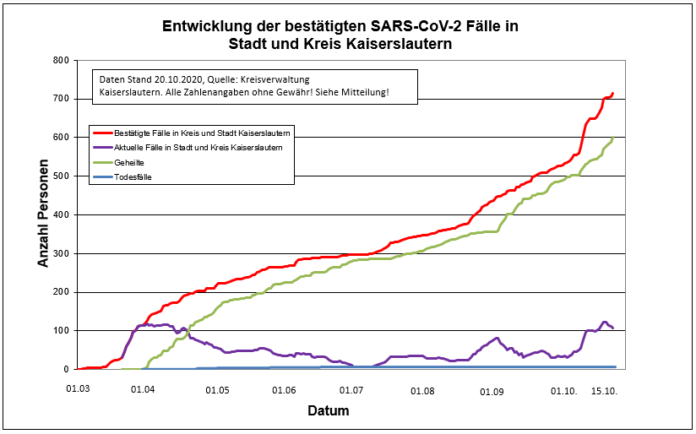 Am 20.10. wurden 9 Neufälle gemeldet (5x Stadt KL, 3 VG E.-A., 1 VG L) und 13 Personen konnten aus der Quarantäne entlassen werden (1x Stadt KL, 1 VG L, 5 VG R.M,, 2 VG W., 4 US Streitkräfte)