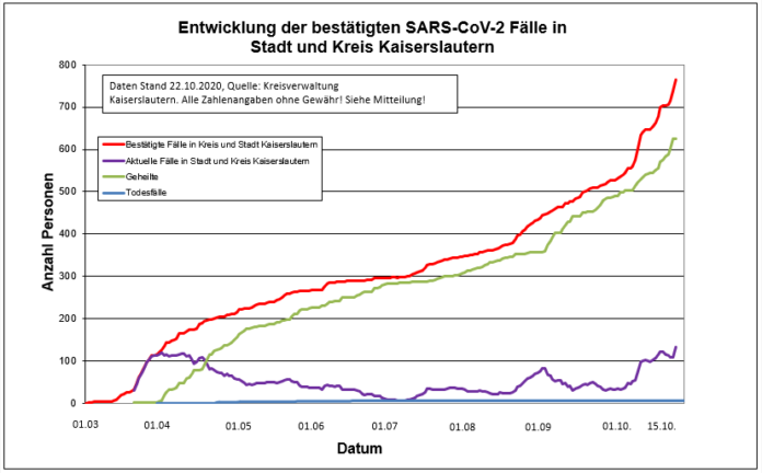Am 22.10. wurden 25 Neufälle gemeldet (14 Stadt KL, 1VG E.A., 4 VG L, 4 VG R.M, 1 VG WB, 1 Streitkräfte). Aktuell sind 133 Personen mit Corona-Infektionen registriert. Insgesamt wurden bislang 764 Indexfälle in Stadt und Landkreis Kaiserslautern registriert.