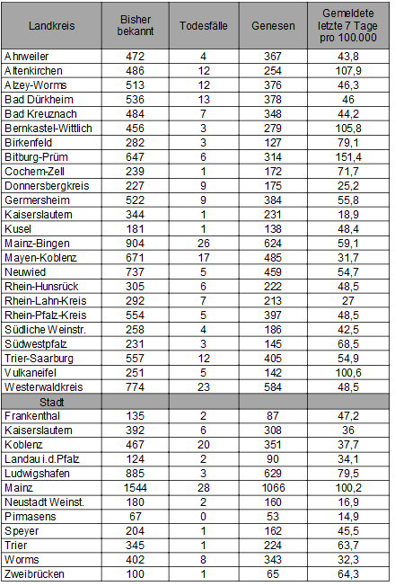 Die oben genannten Zahlen entsprechen den in der Meldesoftware des Robert Koch-Instituts übermittelten laborbestätigten Fällen einer COVID-19 Erkrankung mit Meldeadresse in Rheinland-Pfalz. Diese werden von den Gesundheitsämtern über die Landesmeldestelle beim Landesuntersuchungsamt an das Robert Koch-Institut übermittelt. Diese Zahlen können vereinzelt von den durch die Kreisverwaltungen kommunizierten Zahlen abweichen.