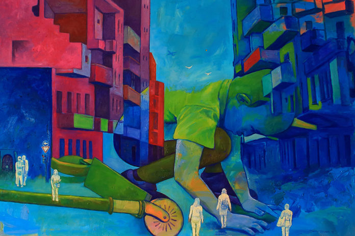 Der Künstler präsentiert seine Malerei in der Schreinerei der KAMMGARN!