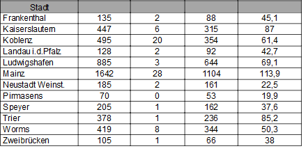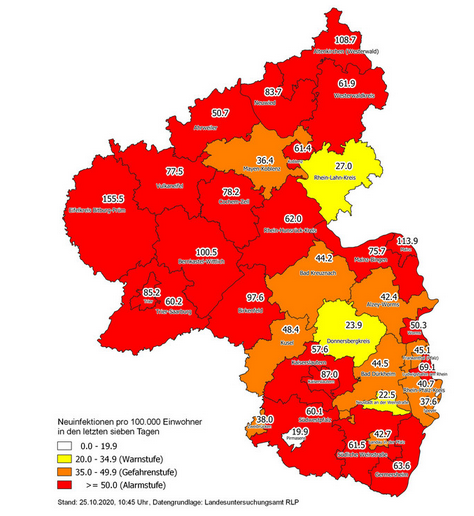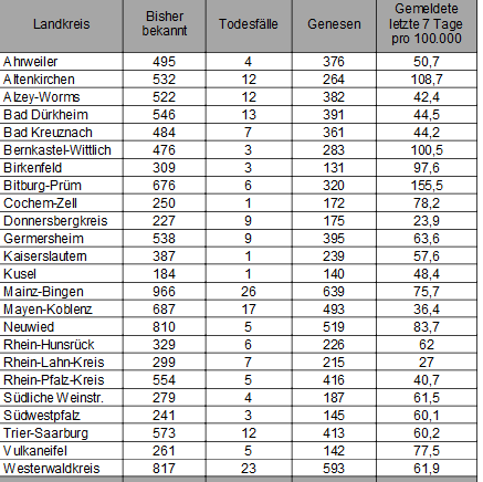 Die oben genannten Zahlen entsprechen den in der Meldesoftware des Robert Koch-Instituts übermittelten laborbestätigten Fällen einer COVID-19 Erkrankung mit Meldeadresse in Rheinland-Pfalz. Diese werden von den Gesundheitsämtern über die Landesmeldestelle beim Landesuntersuchungsamt an das Robert Koch-Institut übermittelt. Diese Zahlen können vereinzelt von den durch die Kreisverwaltungen kommunizierten Zahlen abweichen.