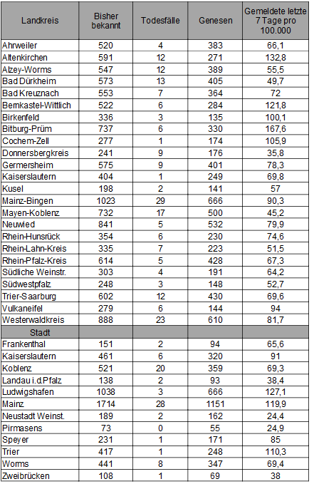 Die oben genannten Zahlen entsprechen den in der Meldesoftware des Robert Koch-Instituts übermittelten laborbestätigten Fällen einer COVID-19 Erkrankung mit Meldeadresse in Rheinland-Pfalz. Diese werden von den Gesundheitsämtern über die Landesmeldestelle beim Landesuntersuchungsamt an das Robert Koch-Institut übermittelt. Diese Zahlen können vereinzelt von den durch die Kreisverwaltungen kommunizierten Zahlen abweichen.