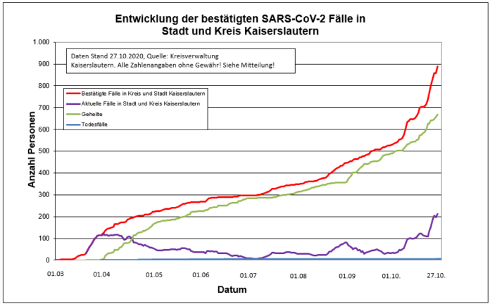 Am 27.10. ist ein Todesfall aus der Stadt KL zu vermelden. 29 neue Indexfälle (9x Stadt KL, 16x LK KL,4x Streitkräfte) wurden registriert. 10 Personen konnten die Quarantäne verlassen (3x Stadt KL, 6x LK KL, 1 Streitkräfte). Aktuell sind 213 Personen mit Corona-Infektionen registriert.