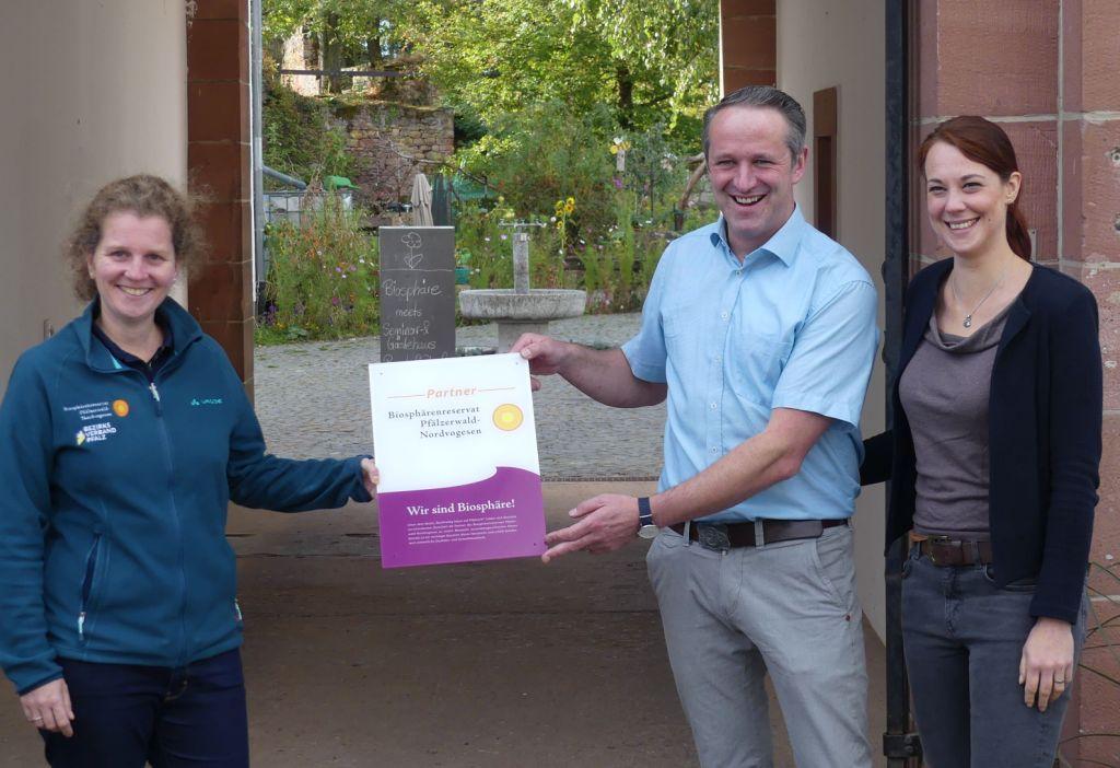Bildunterschrift: Neuer Partnerbetrieb: Die Direktorin des Biosphärenreservats Pfälzerwald-Nordvogesen, Dr. Friedericke Weber (links), übergibt das Schild an Karsten und Ann-Kathrin Bessai (Foto: Biosphärenreservat)