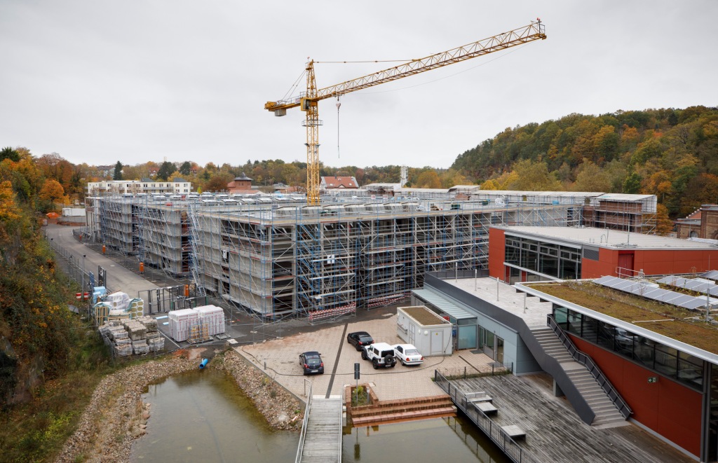 Der dreigeschossige Neubau entsteht anstelle der zurückgebauten Lagerhallen der ehemaligen Kammgarnspinnerei. Die denkmalgeschützte Buntsandstein-Fassade, ein Beispiel für Fabrik-Architektur im 19. Jahrhundert, wurde während der Abrissarbeiten mit Stahlstützen gesichert und ist nun in der Rohbaukonstruktion verankert. Das Gebäude besteht aus acht Teilgebäuden, die in der Draufsicht vier parallel angeordnete längliche Flügel von jeweils 23 Metern Breite, rund 66 Metern Länge und 11,5 Metern Höhe bilden. Eine quer durchlaufende Mall von circa 118 Metern Länge verbindet alle Teilgebäude. Im Erdgeschoss sind Labors und Werkstatträume vorgesehen, teilweise zwei Geschosse hoch. Im 1. und 2. Obergeschoss sind eingeschossige Labors und Werkstätten geplant sowie Büros in allen drei Geschossen.