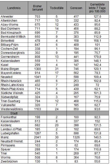 Die oben genannten Zahlen entsprechen den in der Meldesoftware des Robert Koch-Instituts übermittelten laborbestätigten Fällen einer COVID-19 Erkrankung mit Meldeadresse in Rheinland-Pfalz. Diese werden von den Gesundheitsämtern über die Landesmeldestelle beim Landesuntersuchungsamt an das Robert Koch-Institut übermittelt. Diese Zahlen können vereinzelt von den durch die Kreisverwaltungen kommunizierten Zahlen abweichen.