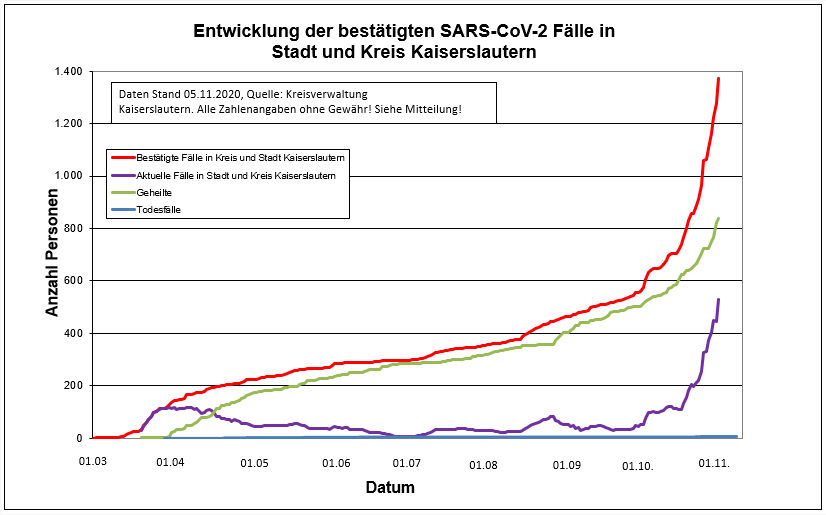 Am 05.11. meldete das Labor 97 neue Indexfälle (38 x Stadt, 47 LK KL, 12 Streitkräfte). 10 Personen wurden aus der Quarantäne entlassen (4x Stadt KL, 6 LKKL)