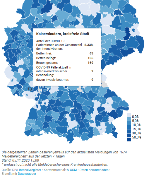 Anteil der COVID-19 PatientInnen an der Gesamtzahl der Intensivbetten (Kaiserslautern Stadt)