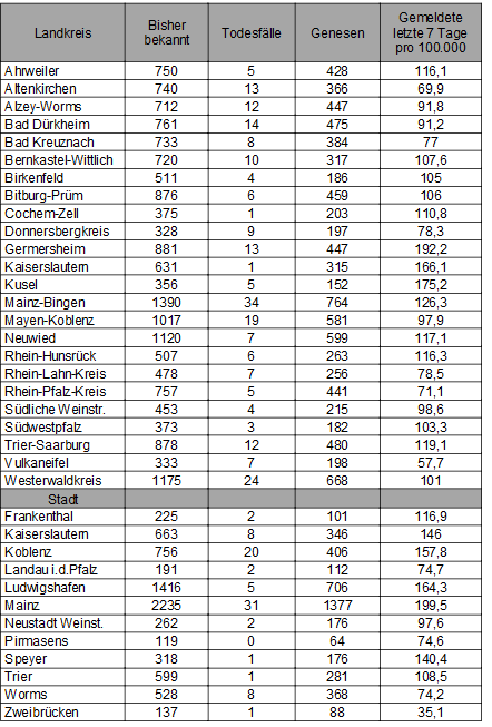 Die oben genannten Zahlen entsprechen den in der Meldesoftware des Robert Koch-Instituts übermittelten laborbestätigten Fällen einer COVID-19 Erkrankung mit Meldeadresse in Rheinland-Pfalz. Diese werden von den Gesundheitsämtern über die Landesmeldestelle beim Landesuntersuchungsamt an das Robert Koch-Institut übermittelt. Diese Zahlen können vereinzelt von den durch die Kreisverwaltungen kommunizierten Zahlen abweichen.