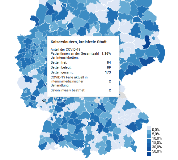 Täglich erfasst das DIVI-Intensivregister die freien und belegten Behandlungskapazitäten in der Intensivmedizin von etwa 1.300 Akut-Krankenhäusern in Deutschland. Im Rahmen der SARS-CoV-2-Pandemie werden zudem auch aktuelle Fallzahlen intensivmedizinisch behandelter COVID-19 PatientInnen aufgezeichnet.
