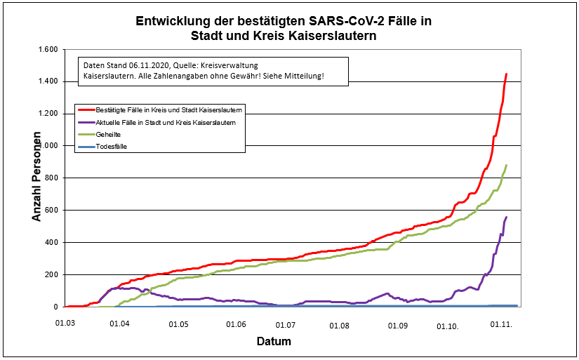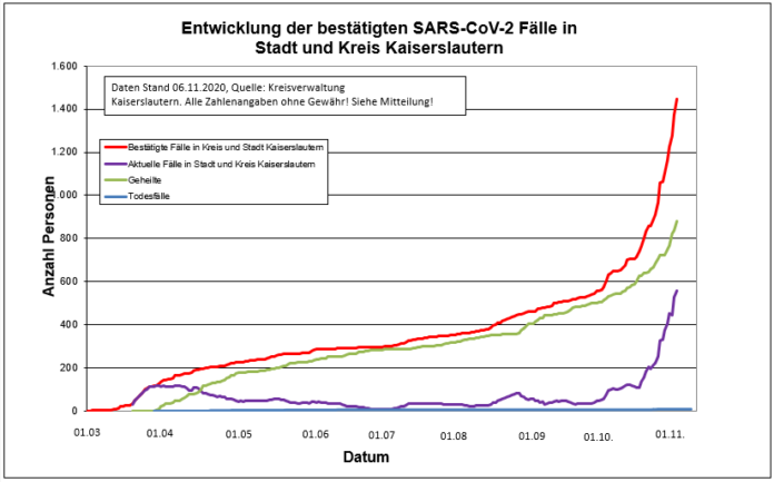 Am 06.11. meldete das Labor 73 neue Indexfälle (32 x Stadt, 40 LK KL, 1 Streitkräfte). 44 Personen wurden aus der Quarantäne entlassen (22x Stadt KL, 22 LKKL)